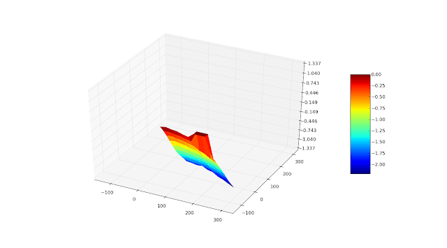 I had to create a simple application that controlled the Mendel to perform the calibration and collate and graph the results. I wrote it in my favorite language, Python. The program essentially takes a reference reading on the bed, then probes the bed at a number of points across its surface, recording the number of steps above or below the expected stop point. Since the Z-axis is screw-drive, it has incredibly high accuracy. My Mendel requires about 2700 steps per mm in the Z-axis. There does appear to be some variation in the micro-switch activation. Making repeated measurements in the same spot shows that it doesn't always return to zero, but the variation is relatively small, +/- 12 steps. Compared to a layer of blue-tape at ~230 steps, I'll live with the variance.
